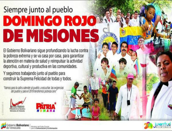 Esta jornada de trabajo denominada Domingo Rojo de Misiones tiene como objetivo llevar servicios de salud y atención deportiva y cultural a las 255 parroquias priorizadas en el Plan para erradicar la pobreza extrema, anunciado por el Presidente Nicolás Maduro el 6 de junio pasado.